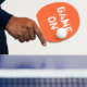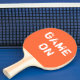 Ping pong paddle en orange avec le texte : Jeu On. Customisez cet objet ou achetez tel quel.