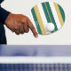 Three-color design with rhythmic stripes. Horizontal lines in three colors for your table tennis racket and Ping Pong paddle. Add your name or text. This variant is the festive color scheme in green, gold, and white.