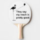 Cette conception stupide présente un flamant très haut avec de longues jambes tenant une raquette de ping-pong, disant "Ils disent que ma portée est plutôt bonne."