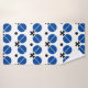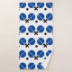 Raquettes de ping-pong de ping-pong et boule noir, bleu coutume de tennis de table serviette de bain ensemble présentant un pictogramme minimaliste icône de paniers de ping-pong noir et noir et de boules. La serviette de bain comprend un motif rayé bleu, noir et blanc et le linge de toilette est de couleur bleu foncé.