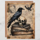 This scrapbook paper seems to be a page from a book of magic--an old parchment sheet with a raven perched on a skull on a stack of old books, with faded text, and drawings of another raven and skull. Wonderfully arcane Gothic imagery! The back is a plain, grungey paper texture, without images or text.