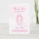 Carte parfaite pour remercier les gens qui ont été réfléchis et généreux le jour de la première communion. L'aquarelle rose douce était l'arrière - plan de la croix rose, hôte et rayons de joie et de grâce. Une police de script moderne ajoute le message de remerciement.