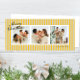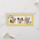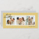 Petites rayures verticales jaunes et gris pâle donnent à cette trois carte de vacances photo une ambiance moderne et chic avec des polices classiques et un long message customisé pour les amis et la famille.