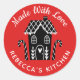 Un autocollant personnalisé "fait avec amour" avec une jolie petite maison en pain d'épice avec un coeur et les mots, fait avec amour sur un arrière - plan de couleur rouge. Personnalisez-le en ajoutant votre propre nom. Une jolie touche finale pour tous vos cadeaux faits maison. Conçu pour vous par Blackberry Boulevard.