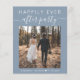 Étage bleu poussiéreux et économique ou faire-part de mariage privé et accueil ou fête de fête. L'avant présente "Happily Ever After Party" dans la typographie blanche moderne et un script blanc élégant avec des swashes, votre photo, les noms et la date mariage. Au contraire, personnalisez votre faire-part mariage et votre invitation à la réception, créez facilement un code QR lié à votre site mariage pour que les invités puissent scanner pour voir vos photos mariages, tous les détails et RSVP en ligne, et ajoutez vos noms dans un script signature.
