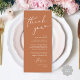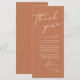 Faites de votre réception de mariage un événement spécial grâce à cet élégant carte de remerciements de mariage, conçu pour être placé dans le cadre du dîner de chaque client. Disposant d’une disposition moderne et minimaliste avec des lettres de script chic, thème en terre cuite marron cuivré, c’est une façon réfléchie d’express de remercier la famille et les amis pour avoir partagé votre grande journée. Parfait pour les dîners mariages, les dîners de répétition ou les réceptions, cette carte personnalisable peut être personnalisée avec vos noms, date et message spécial. Un détail élégant qui fait office de décor de table mariage, donnant aux clients un souvenir chaleureux de la soirée. Idéal pour des thèmes mariages modernes, rustiques ou classiques.