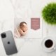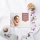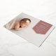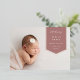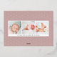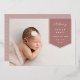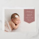 Simple faire-part de naissance moderne dispose d'une seule photo horizontale à fond saigné ou à orientation paysage avec une bannière rose en feuille d'or taillée en haut à droite, portant le nom du bébé, la date de naissance et les statistiques de naissance. Ajoutez un message personnel à l'arrière, ainsi que trois photos carrés supplémentaires.