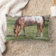 Ce coussin a deux images différentes d'un beau cheval Appaloosa, l'une est plein corps et l'arrière du coussin a une image rapprochée du cheval pâturant avec seulement la tête et deux pattes avant. Il a le nom du cheval sur le devant du coussin.