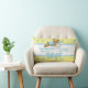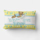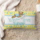 Doux coussin lombaire dans le jaune tendre et bleu aqua avec des étoiles, des biberons et des tenues sur place. Devant du coussin se trouve un ours en peluche de bébé posé sur un coussin. La zone ci-dessous contient des zones de texte prêtes à vous customiser avec le nom et la date de naissance du texte. Le bas de la bannière a Welcome Sweet Baby texte art.
