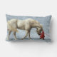 Une belle image d'un cheval blanc conduit par une fille en manteau rouge lors d'une tempête de neige orne ce coussin du MoJo américain. Parfait pour vous-même ou comme cadeau. PERSONNALISABLE .