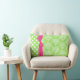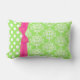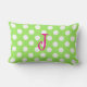 Ajoutez une touche de couleur joyeuse à votre chambre, avec ce coussin décorateur ludique vert et rose, avec un design pois vert et blanc, sur le devant gauche et l'arrière, de la coussin et un joli design damassé, sur le devant droit. Des graphismes doux d'un ruban en satin rose avec arc, sépare les deux motifs, sur le devant. Un gros monogramme blanc rose d'une lettre, à l'arrière du coussin, est prêt à être personnalisé. Belles couleurs fraîches avec deux coussins différents.