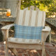 Carreau extérieur de plaid de gorge aux nuances bleues et kaki qui fonctionnent bien avec la finition, le gris, bronzages naturels, et les meubles extérieurs noirs. Prêt à l'emploi dans 20x20, 16x16, et Lumbar.