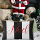 Ce coussin lombaire de vacances comprend le mot "Noel" en texte rouge sur un motif aux épaisses bandes verticales noires et blanches.