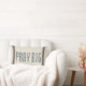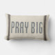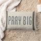 Le coussin lombaire avec les rayures brunes et les mots "prient grand" dans le lettrage gris.