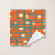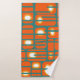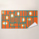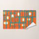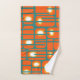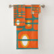 Cet ensemble de serviettes a un design moderne du milieu du siècle de rectangles orange avec des cercles blancs et or en eux et des lignes horizontales turquoises les traversant sur un champ de turquoise.