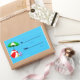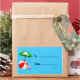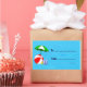 Un autocollant personnalisé avec l'art de la plage ou de la piscine d'une boule de plage rouge, un parasol vert, des sandales de vacances et de l'huile de bronzage sur un arrière - plan bleu aquatique avec des vagues bouclées.