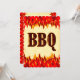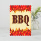Une fête d'anniversaire personnalisée ou une invitation à la remise des diplômes du barbecue avec des flammes rouges et orange lisant le barbecue sur le devant et du texte modifiable en lettres marron et rouge à l'arrière.
