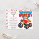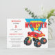 Cette invitation à la fête d'anniversaire pour camion monstre mignon est appropriée pour les garçons jusqu'à l'âge de sept ou huit. L'avant est ornée d'un camion monstre rouge vif, et d'un emblème bleu et jaune qui indique MONSTER de l'autre côté. Votre texte personnalisé est en rouge, noir et gris correspondant sur le côté. Tout est posé sur un arrière - plan blanc. Le dos de l'invitation est blanc avec un motif de drapeaux rouges à damiers course. Graphiques de Prettygrafik Design, © Prettygrafik.com