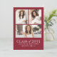 The front showcases three photos arranged in a clean collage layout, framed by a subtle white border. “Class of 2026” (or any year), the graduate’s name, and school are displayed in simple, modern white fonts that stand out beautifully against the deep red background.