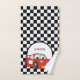 Mignonne voiture de course rouge caricature sur le drapeau noir et blanc à damiers serviette de bain, serviette et linge de toilette pour votre petit garçon. Personnalisé avec le nom de votre enfant.