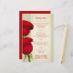 Modèle de menu mariage de roses rouges pour un mariage ou une fête d'anniversaire. Deux rosebuds réalistes s'ouvrent et décorent le bord du papier feutre blanc cassé avec un aspect superposé. Le texte rouge est facile à customiser en trois endroits avec un titre de menu, la liste des options de nourriture et les noms de couple avec la date de l'événement. Utilisez des majuscules et des espaces pour créer la partie menu au besoin. L'inverse est de couleur rouge foncé.