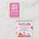 Votre commerce de sucreries regorge-t-il de délices sucrés et de bonbons prêts à être vendus? Partagez sur votre pays des merveilles de bonbons avec une carte de coupon rabais qui attirera les clients pour passer des commandes à votre boutique. Qui n'aime pas les bonbons, les chocolats, les cupcakes et les fudge ? Ce design ludique éveille la joie avec un motif de bonbons de popsicles, de crème glacée, de sucettes et de bonbons aux couleurs joyeuses qui feront que les clients se livrent à la douceur dans votre magasin. Vous pouvez ajouter cette carte d'offre spéciale dans les sacs d'attrapage d'événements et d'autres façons de faire la publicité de votre vente et obtenir plus de clients à votre confiserie physique ou en ligne ou chocolat magasin. S'est tourné vers les confiseries et les boulangeries qui vendent des produits de boulangerie, des cupcakes, des bonbons, des chocolats, des glaces et d'autres compagnies de sucreries et de desserts. La carte vous permet d'entrer votre pourcentage de vente, les modalités et les conditions et d'ajouter vos informations commerciales.