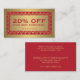 Une carte de coupon à rabais festive avec une bordure à motifs en or rouge et faux matte. Idéal pour les promotions de vacances ou à tout moment de l'année. Customisez les champs avec votre propre remise et texte. © 1201AM CREATIVE
