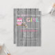Regarde qui a une petite fille ! Célébrez la Mère à être avec cette invitation à la fois branchée et adorable. Il a un arrière - plan de grains de bois gris. Le long du sommet se trouve une branche avec une chouette chouette rose perchée sur la branche qui a des fleurs à la fin. Il a "GIRL" est des lettres de police rayées colorées. Personnalisez avec vos informations de fête dans le centre. Cette invitation est entièrement personnalisable.