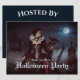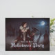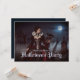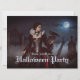 Une mystérieuse femme dans un pourpre et une robe noire se dresse au milieu de vieilles pierres tombales sous une pleine lune brillante. Dentelle, crânes et corbeau noir complètent son élégance étrange, car la brume bouillonne à travers les portes ombragées du cimetière. Invitation Halloween