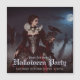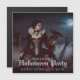 Une mystérieuse femme dans un pourpre et une robe noire se dresse au milieu de vieilles pierres tombales sous une pleine lune brillante. Dentelle, crânes et corbeau noir complètent son élégance étrange, car la brume bouillonne à travers les portes ombragées du cimetière. Invitation Halloween