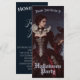 Une mystérieuse femme dans un pourpre et une robe noire se dresse au milieu de vieilles pierres tombales sous une pleine lune brillante. Dentelle, crânes et corbeau noir complètent son élégance étrange, car la brume bouillonne à travers les portes ombragées du cimetière. Invitation Halloween