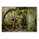 Old wagon wheel with a clematis vine photo with an antique grunge overlay greeting card to remember times gone past.