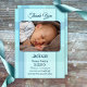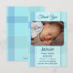 Carte de remerciements bébé neutre genre avec une photo de votre propre bébé sur un arrière - plan pastel bleu turquoise plaid.