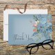 Ce design carte de remerciements mariage présente de belles flancs d'aquarelle bleu et orange brûlé sur un rectangle de flou blanc doux placé sur un arrière - plan bleu poussiéreux. Doux et délicat, parfait pour toute saison. Créé par Simply Farmhouse Press.
