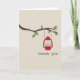 Un carte de remerciements avec l'illustration d'une lampe à huile rouge accrochée à une branche d'arbre avec un feuille vert Texte à l'avant dit "Merci". L'intérieur est vide. Cette carte peut également être achetée en taille carte pour notes plus petite. Recherchez des invitations de mariage assorties et plus encore chez Jill's Paperie.
