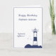 Une carte d'anniversaire entièrement personnalisable avec une illustration d'un phare et une citation personnalisable, le tout dans les tons bleu marine. À l'intérieur, vous avez un message personnalisable pour le destinataire de la carte.