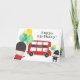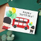Carte d'anniversaire à thème Red London Bus mignonne et amusante avec un bus à Londres rouge avec une bannière avec un nom personnalisé. D'autres accents mignons en font une carte spéciale pour le garçon d'anniversaire.