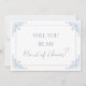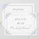 Créez une proposition de fête de mariée mémorable pour votre Maid of Honor qui est aussi intemporelle que votre amour avec ces cartes de proposition de Mariage minimal chic bleu et blanc qui exsument la combinaison parfaite d'un design élégant simple avec une esthétique de vieux argent côtier. Le design polyvalent est parfait pour le couple qui crée un thème romantique avec une combinaison classique de script et de typographie et un élément graphique vintage légèrement rétro. Conçu par Simple Desert Designs Studio. Faites-nous un message pour des couleurs plus customisées pour correspondre à votre teinte spécifique.
