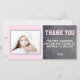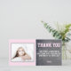 Jolie carte de remerciement d'anniversaire pour remercier vos invités. Personnalisez la carte avec votre photo et votre nom. Vous pouvez également modifier le texte de remerciement et écrire le vôtre. Le texte est en rose et blanc - parfait pour une fille. Le fond est une texture moderne de tableau noir gris et rose pastel.
