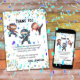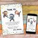 Cette carte de remerciement de fête d'anniversaire de ninja fait partie d'un ensemble assorti d'accessoires de fête d'anniversaire. Votre enfant d'anniversaire va adorer chaque moment de cette journée spéciale. Ce design présente diverses nuances de bleu, d'orange et de marron, ainsi que des polices faciles à lire et un espace suffisant pour ajouter votre message unique.