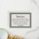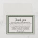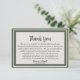 Une belle façon d'honorer la vie d'un être cher est d'envoyer des cartes de remerciement à ceux qui ont assisté au service ou vous ont aidé en cette période de deuil. Cette carte de remerciement élégante et simple avec une bordure verte classique rend les choses un peu plus simples pour vous pendant cette période difficile. Utilisez le message de remerciement déjà fourni ou créez votre propre message personnalisé.