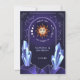 Carte de remerciement pour l'événement du Soleil Mystique présentant un design mystique inspiré de l'astrologie, de l'ésotérisme, de l'occulte et d'éléments mystérieux. Ce design présente des teintes de bleu, de violet et d'orange, un fond étoilé, des cristaux, des constellations, un soleil avec un visage et des phases lunaires. Le design peut être personnalisé pour tous les types d'événements, y compris les douches de mariée, les mariages, les anniversaires, les fiançailles, les anniversaires de mariage, les enterrements de vie de jeune fille, les remises de diplôme, les douches de bébé, les retraites, les pendaisons de crémaillère et autres fêtes. Comprend un modèle pour une personnalisation personnelle.