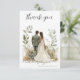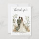 Célébrez votre mariage avec style avec cette élégante carte de remerciement, mettant en vedette une illustration romantique d'une mariée et d'un marié entourés de verdure botanique douce et de tons floraux chauds.