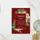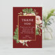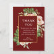 Cette élégante carte de remerciement présente un cadre doré avec une rose aquarelle et une branche de verdure comme fond de modèle. Les mots « Merci » sont écrits en police blanche sur un fond rouge foncé. Le nom du couple, la date et le lieu du mariage sont également inclus en police noire sur fond blanc. Une photo élégante du couple est ajoutée à la carte avec leurs noms et la date et le lieu du mariage écrits en dessous.