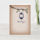 Une carte de remerciement présentant une illustration d'une lanterne de camping bleue suspendue à une branche d'arbre avec des feuilles vertes. Le texte sur le devant indique "Merci". Le fond est inspiré du carton. L'intérieur est vierge. Cette carte peut également être achetée en format carte de note plus petite. Recherchez les invitations de mariage assorties et plus encore chez Jill's Paperie.