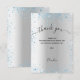 Fond aspect argenté, décoré de paillettes faussement bleues claires, scintille. Grand script calligraphié avec fioritures et le texte : Merci. Personnalisez et ajoutez votre note de remerciement et votre nom.
