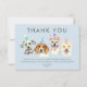 Jolie carte de remerciement à envoyer après la fête d'anniversaire sur le thème de chiot de votre enfant. Cette carte contient déjà du texte que vous pouvez utiliser tel quel ou modifier facilement en ligne. Illustration de 4 chiens (dalmatien, beagle, terrier pit bull) avec des chapeaux de fête avec le texte "merci" au-dessus d'eux.