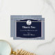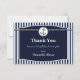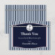 Cette carte de remerciement plate nautique comporte une ancre et une corde sur un cadre bleu marine avec une bordure blanche. Le fond est un motif rayé bleu clair et bleu marine. C'est idéal comme note de remerciement pour vos invités de baby shower. La carte d'invitation de baby shower du même design est également disponible. Cette carte de remerciement de baby shower convient à un thème nautique pour garçon et est prête à être personnalisée.