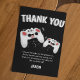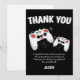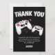 Envoyez une carte de remerciement spéciale à vos amis, les remerciant d'avoir assisté à votre fête et leur exprimant votre gratitude pour leurs cadeaux. Présentant deux manettes de jeu sur fond noir, avec un texte ludique qui dit "MERCI" et "j'ai apprécié le gâteau et le cadeau aussi, mais ma partie préférée était de vous voir ! MERCI D'ÊTRE VENUS À MA FÊTE ET POUR LE SUPERBE CADEAU" et "LEUR NOM. Tous les styles de police et les couleurs de fond peuvent être modifiés en cliquant sur le lien Personnaliser davantage après la personnalisation.