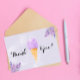 Cette carte de remerciement pour mariage sur le thème de la lilac fait partie de la collection Ice Cream Social, avec un fond pastel et des fleurs, parfaite pour conclure votre événement avec style !